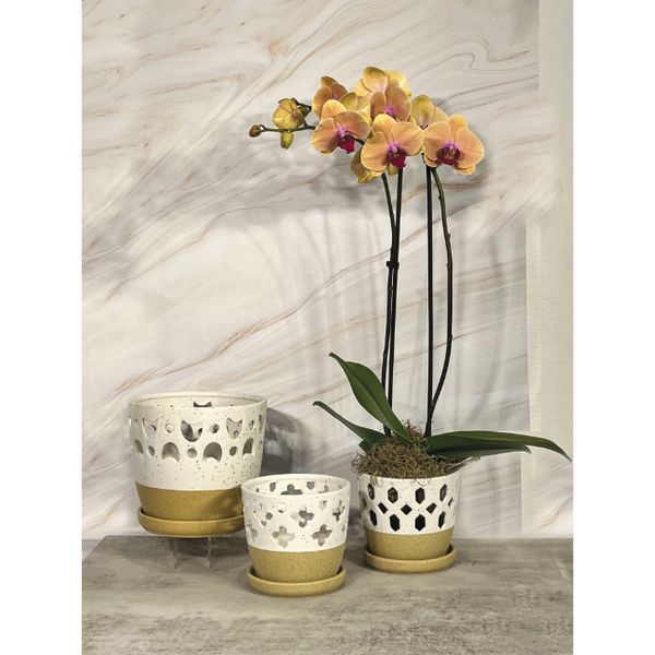 Arabesque Orchid Pot with Attached Saucer, 7.5" x 6.75", White Sand, Case of 3 (Assorted Designs, 3 each)
