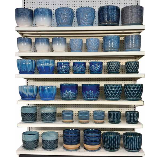 Blue Tone Planters Planogram: Beatrice Etched Planter with Attached Saucer, Beach Fern Planter with Attached Saucer, Naomi Planter with Attached Saucer, Petal Bowl with Attached Saucer, Sofia Planter with Attached Saucer, Cassia Pot with Attached Saucer, Abra Ogee Planter with Attached Saucer, Ellora Planter with Attached Saucer, Groovy Pot with Attached Saucer, Assorted Colors