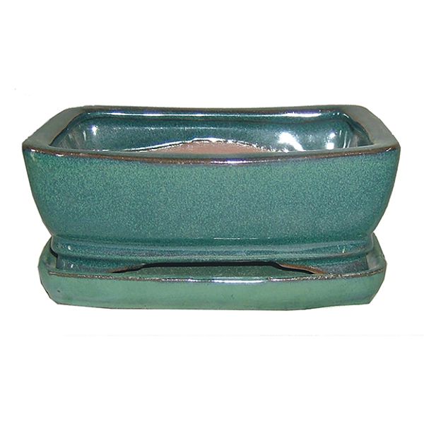 Bonsai Pot with Saucer, 8" x 6.25" x 3", Assorted Colors: Dark Moss Green, Oxblood, Mustard, Dark Brown, Dark Navy & Beige, Case of 6 (1 each)