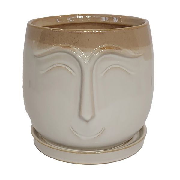 Happy Pot with Attached Saucer, 6'' x 5'', Cream & Tan