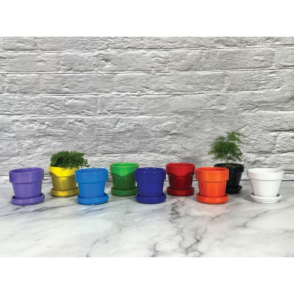 Mini Standard Pot with Attached Saucer, 3" x 2.75", Assorted Colors: Lilac, Yellow, Cyan, Lime, Reflex Blue, Red, Orange, Black & White, Case of 36