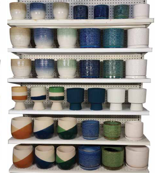 Shelf #2&3: Beatrice Etched Planter with Attached Saucer, 7" x 5", Camel; Beatrice Etched Planter with Attached Saucer, 7" x 5", Azure Blue; Beatrice Etched Planter with Attached Saucer, 7" x 5", Spring Green; Amelia Cylinder with Attached Saucer, 7.25" x 6.25", Blue; Amelia Cylinder with Attached Saucer, 7.25" x 6.25, Turquoise; Amelia Cylinder with Attached Saucer, 7.25" x 6.25, White