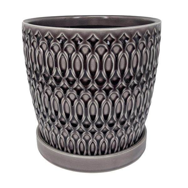 Nouvelle Scrolled Planter with Attached Saucer, 5" x 5", Pewter, Case of 6